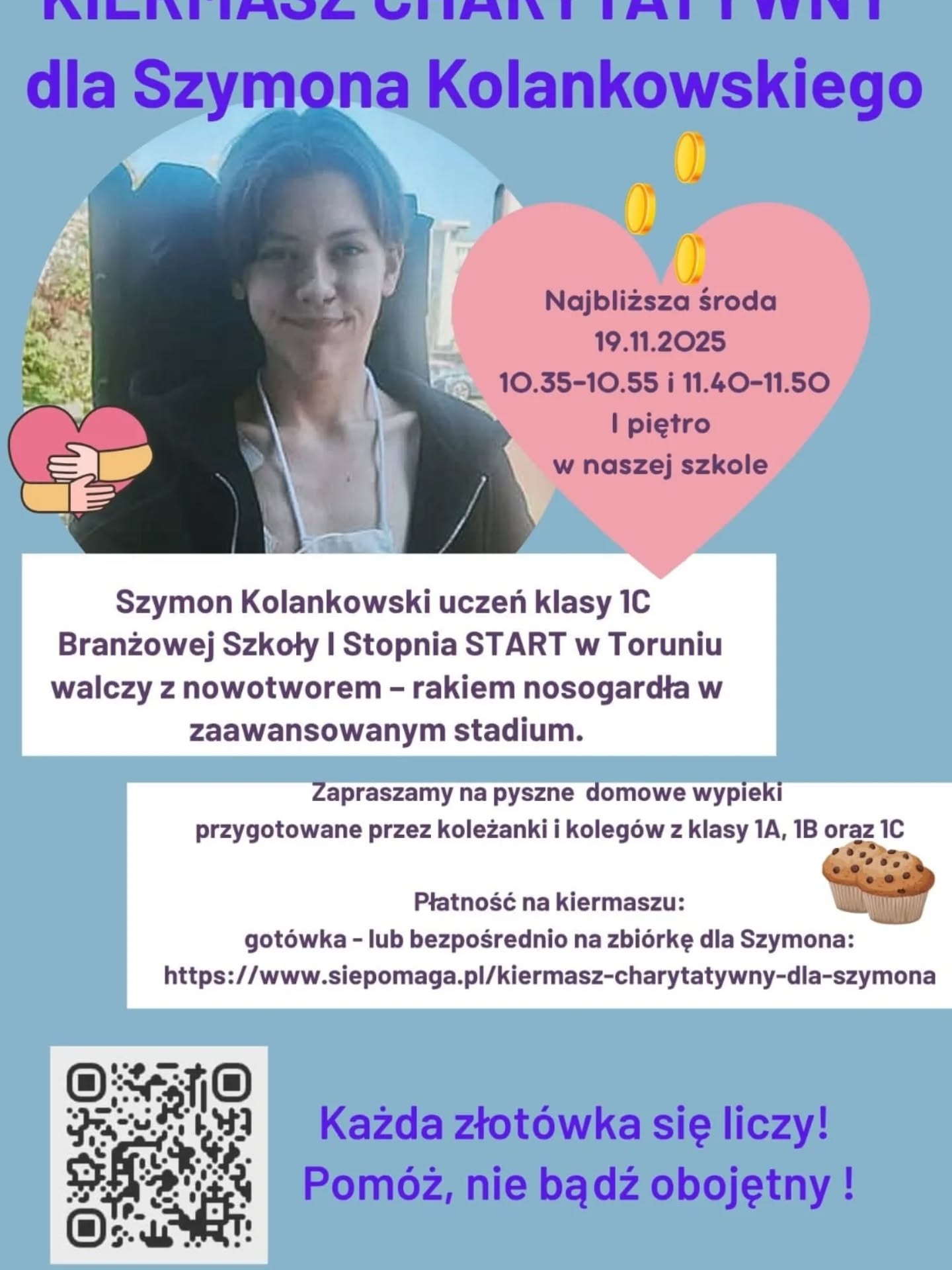 W najbliższą środą tj. 19.11.2025 podczas przerw o godzinie 10.35-10.55 oraz 11.40-11.50 w naszej szkole zostanie zorganizowany KIERMASZ CHARYTATYWNY dla Szymona Kolankowskiego, Naszego ucznia Branżowej Szkoły I Stopnia START w Toruniu, który walczy z nowotworem – rakiem nosogardła w zaawansowanym stadium.
