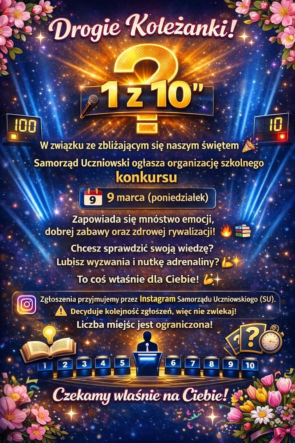 W związku ze zbliżającym się Waszym świętem, Samorząd Uczniowski ogłasza organizację szkolnego konkursu „1 z 10”.